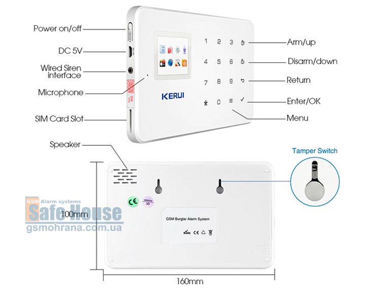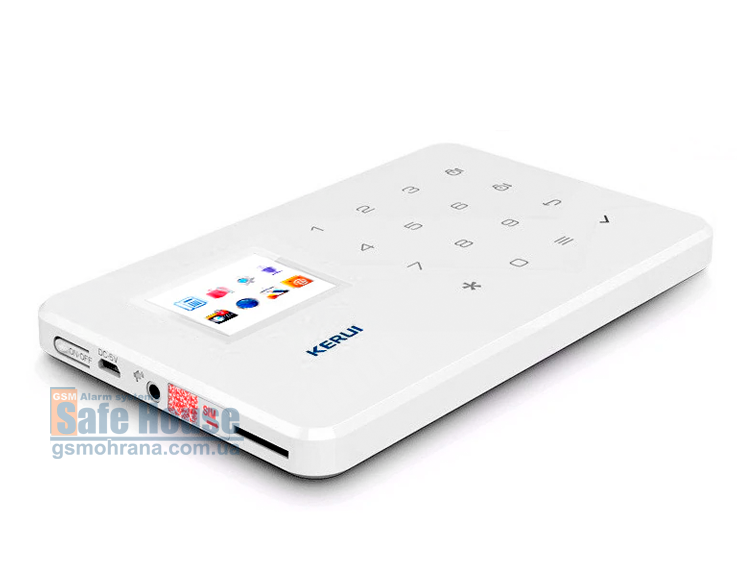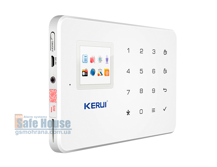 Имеющаяся сенсорная клавиатура может быть заблокирована и использовать ее можно только после ввода персонального PIN-кода. Клавиатура предназначена для быстрого включения/отключения режима охраны при помощи специальных кнопок. Также с помощью клавиатуры легко управлять системным меню и комфортно настраивать GSM сигнализацию Kerui G18. А при необходимости использовать системный блок в качестве телефонного аппарата клавиатура служит для набора номера.