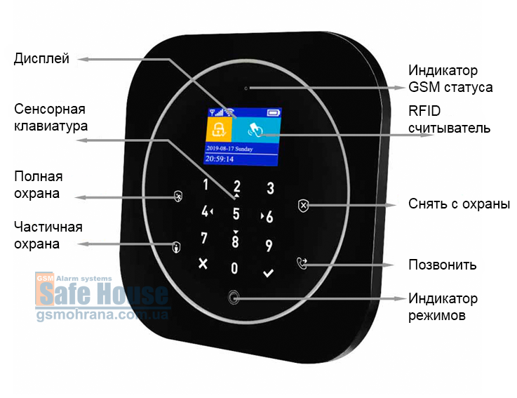 Хост системы SH-012GW имеет встроенный микрофон, который используется для прослушивания охраняемого помещения и динамик для возможности двухсторонней телефонной связи. Хост SH-012GW оборудован сенсорной клавиатурой, которая имеет отдельные кнопки включения и отключения режима охраны и кнопку частичной охраны. Клавиатуру можно заблокировать персональным PIN-кодом для исключения несанкционированного управления системой посторонними людьми. При вводе пять раз подряд неправильного пароля клавиатура блокируется на полторы минуты.