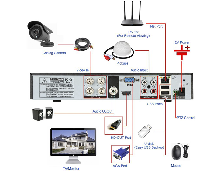 Просматривать в реальном времени изображение с камер и записанное видео можно через подключенный к видеорегистратору монитор или телевизор. Для этого в регистраторе имеются порты HDMI и VGA. А для вывода видео со звуком есть аудиовыход A-OUT. Не смотря на свою профессиональную «заточку» видеорегистратор имеет дружелюбный интерфейс с русским языком, поэтому интуитивно понятен.