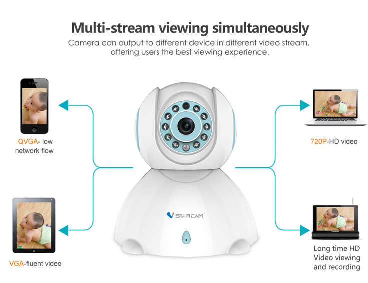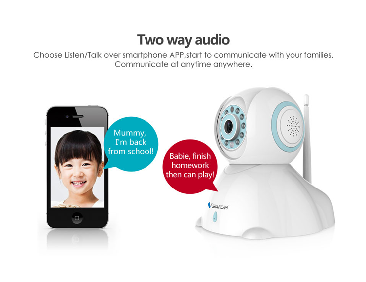 Поворотная Wi-Fi Smart IP камера Vstarcam C42 оснащена мегапиксельной матрицей которая передает качественное HD изображение с разрешением до 1280*720 пикселей, что дает высокую детализацию картинки. На такой картинке легко распознать не только лицо человека находящегося в комнате, но и более мелкие детали. Наличие встроенного микрофона и динамика позволяют вести видеонаблюдение со звуком, а при необходимости включить двухстороннюю связь и успокоить ребенка, если он заплакал. При этом, трансляция видео в высоком разрешении абсолютно не создаёт нагрузку на интернет-канал, так как камера C42 использует мощный видеокодек H.264 для максимального сжатия видеопотока. Это позволяет полноценно использовать IP камеру C42 даже там, где скорость интернета невысокая или нестабильная.