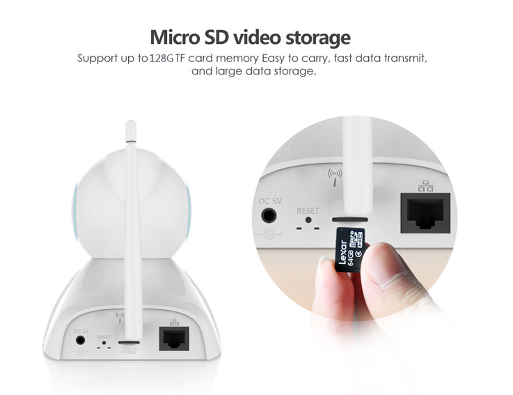 В поворотной Wi-Fi Smart IP камере Vstarcam C42 имеется слот для карты памяти формата micro-SD. Можно использовать SD-карты объемом до 128Гб. Важно, что при пропадании или полном отсутствии связи с Интернетом камера все равно сохранит важные кадры, записав видео-файлы на SD-карту, также с установленной картой памяти IP камера C42 может работать локально без подключения к Интернету как видеорегистратор.